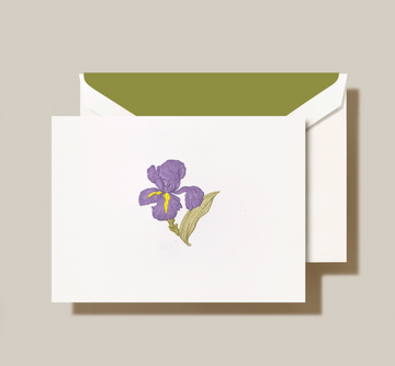 The elegant iris, symbolic of wisdom, hope, and trust, adorns this pearl white note. The rich purple accented with vibrant yellow is masterfully engraved on pearl white cotton paper. Complete with a coordinating lined envelope, the Engraved Iris Note is perfect for delivering words of thanks or sharing personal correspondence.